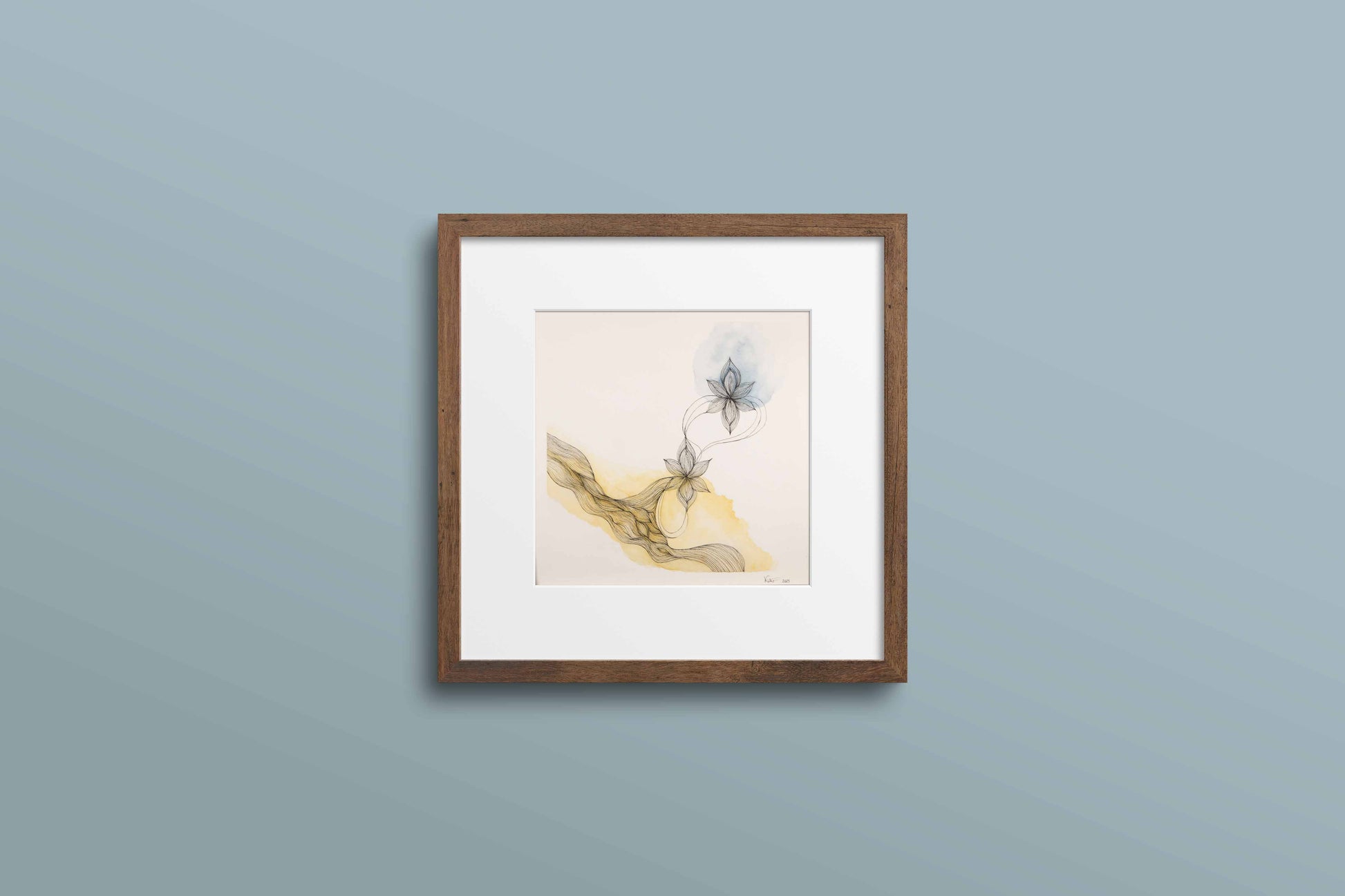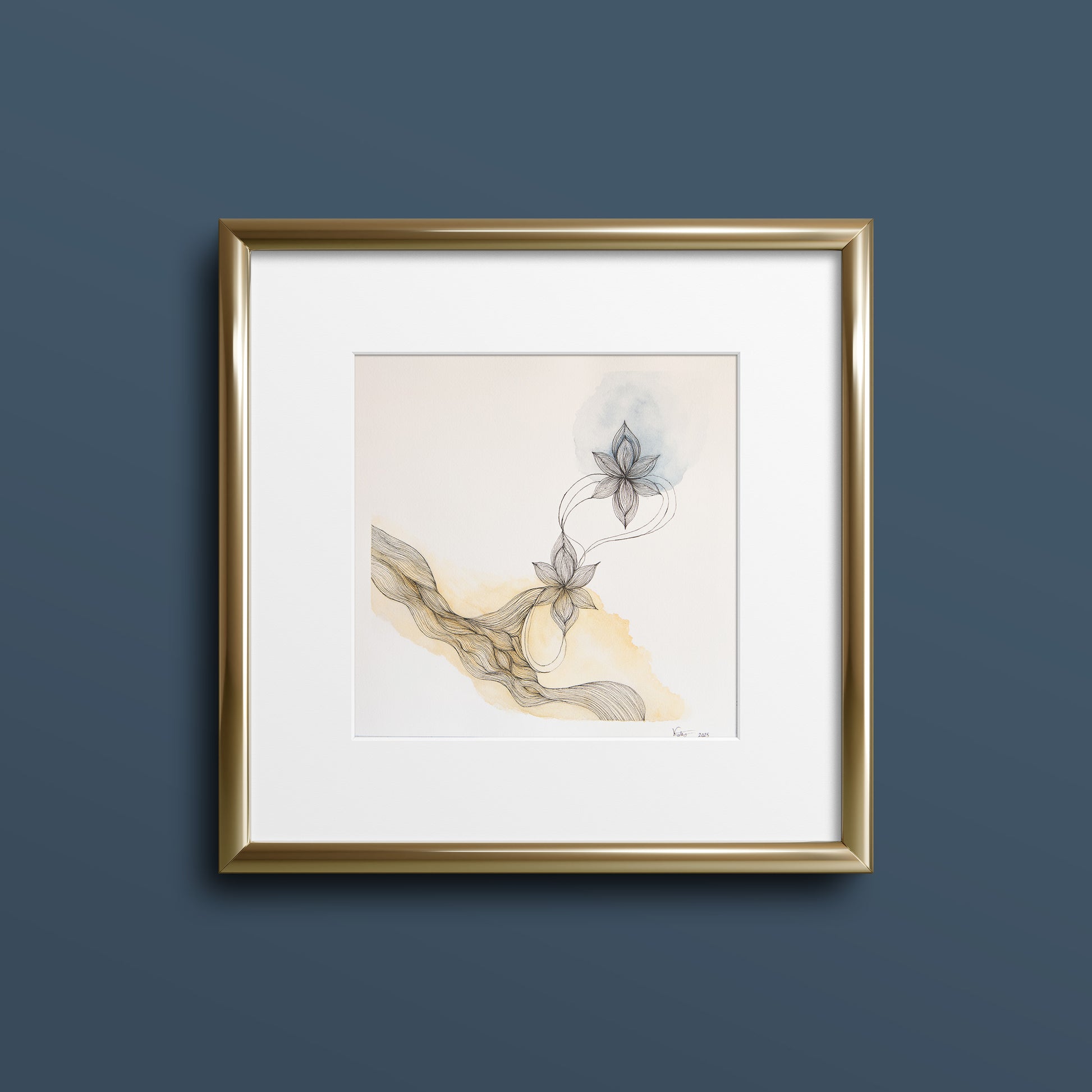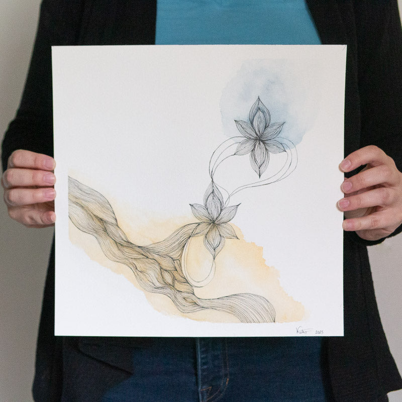 A meditation in ink and watercolor, this 12" x 12" original artwork invites you to pause and notice what lies below the obvious. Delicate linework, drawn with Sakura archival pigment liners, intersects with layered washes of Derwent Inktense watercolor pencil on textured 140lb Arches cold-pressed paper. The interplay between control and flow reflects the quiet tension of things unsaid—the way emotions ripple beneath stillness, and stories live in silence.