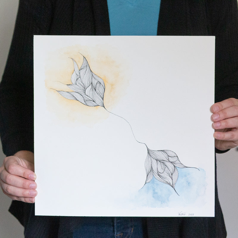 This 12" x 12" original artwork is a quiet tribute to the invisible bonds that hold us—across time, distance, and silence. With layered washes of Derwent Inktense watercolor pencil and intricate linework drawn in Sakura archival pigment liners, the piece weaves together movement and stillness on Arches 140lb cold-pressed watercolor paper.